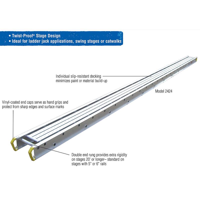 The 3200 stage platforms offer a 750 pound duty rating and allows for 3 people on one plank. The TWIST-PROOF design is ideal for ladder jack applications, swing stages or catwalks. Each stage is 28" wide.
