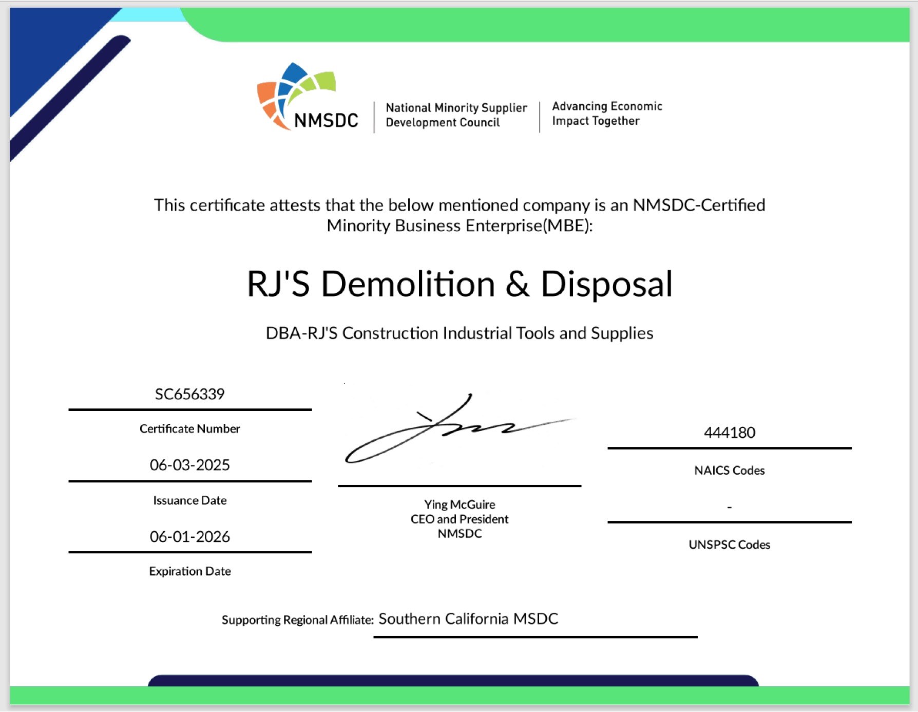 RJ’s Minority Certification